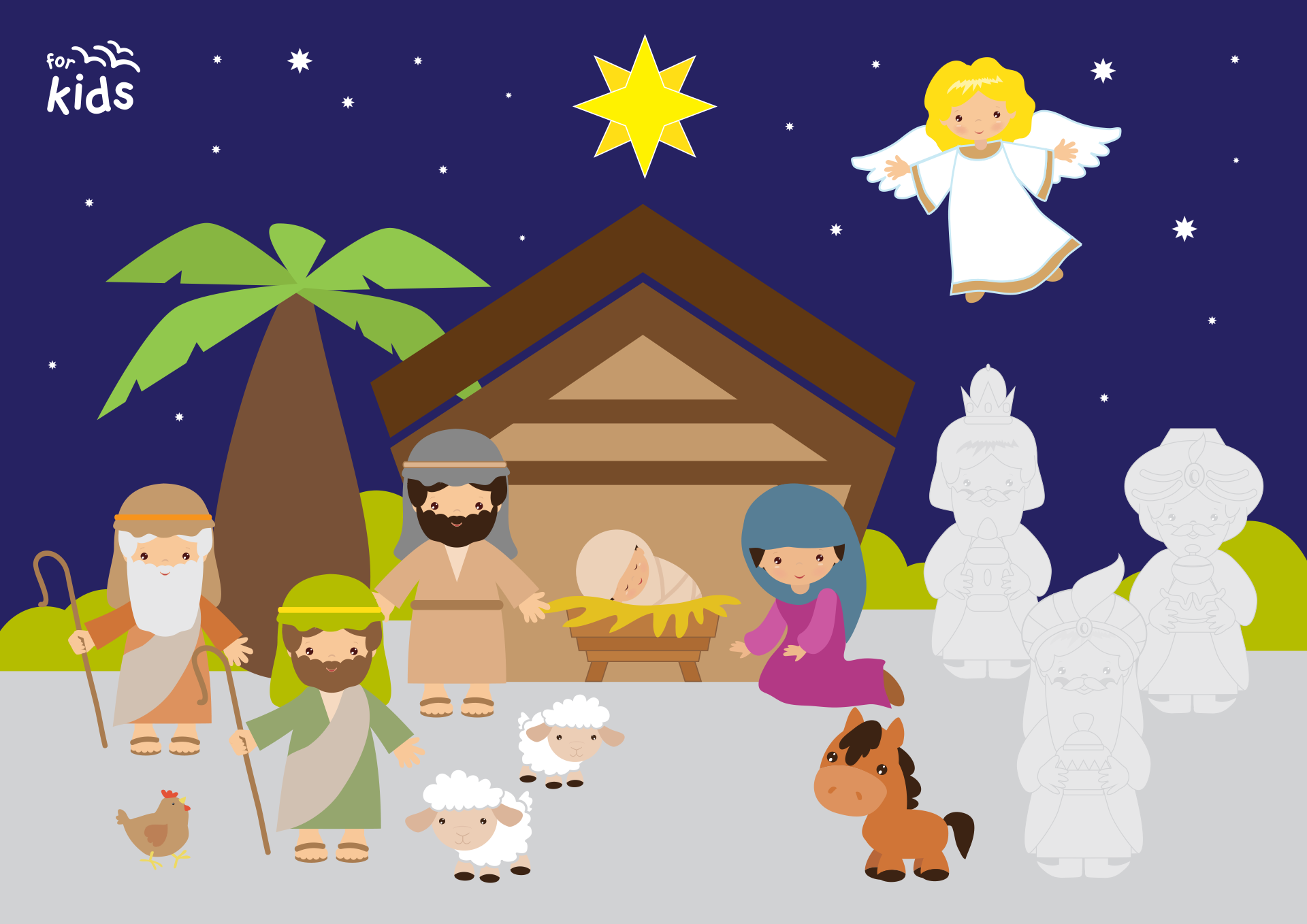 Draw a picture of the shepherds in the fields when they saw the star and the angels or when they went to visit Mary, Joseph and Jesus.